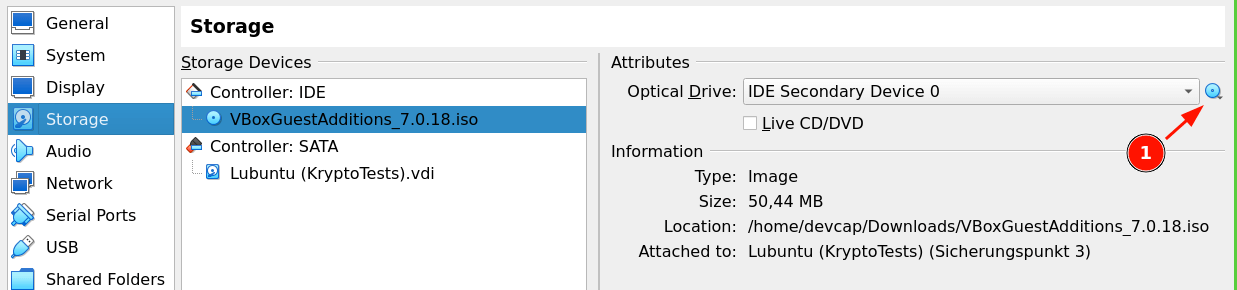 To do this, go to "Settings" in VirtualBox and then to "Storage". Here you select your downloaded ISO file using the disk symbol (1). This now selected ISO file will be mounted as a drive when you start your VM.