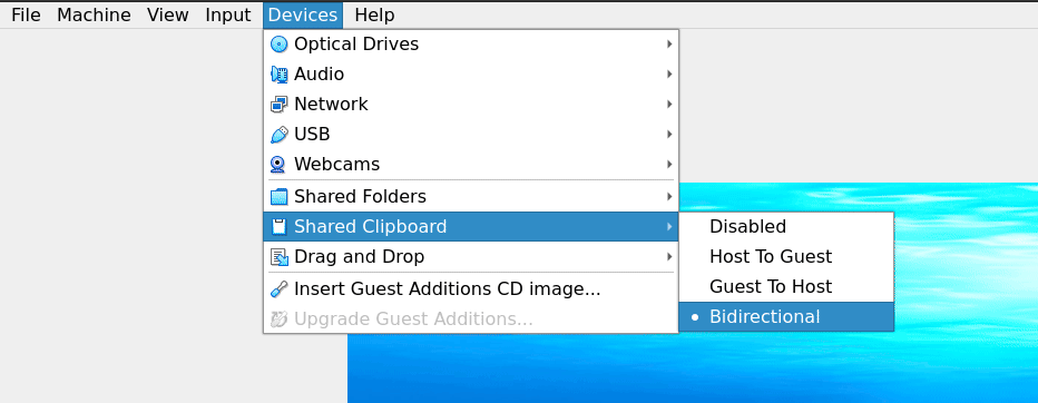After restarting the VM, the guest extensions are active. To test this, you can open the menu and set Shared clipboard to bidirectional (see image). Once this is activated, you can use copy & paste between your guest and host.